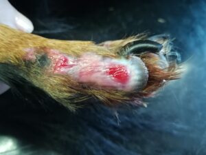 Majitelka přišla s dvouletým jezevčíkem s několik dnů špatně se hojící řeznou ránou na zadní pacce. Na jiném pracovišti údajně zvažovali amputaci.