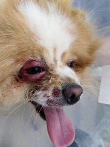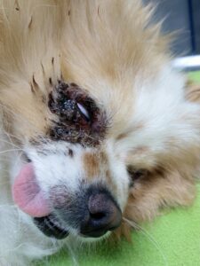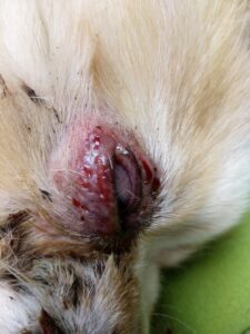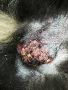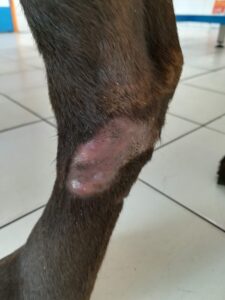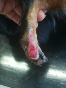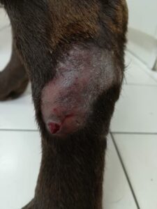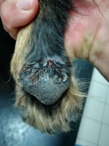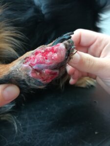 Majitelka přišla s dvouletým jezevčíkem s několik dnů špatně se hojící řeznou ránou na zadní pacce. Na jiném pracovišti údajně zvažovali amputaci.