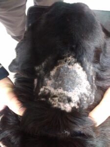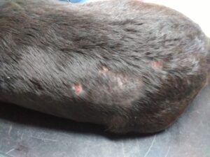 U 8 letého Labradora se objevily kožní změny v oblasti kohoutku a zad. Když k nám majitel po asi měsíci přišel, byly kožní změny tvrdé, okolí zánětlivě zarudlé. Cytologické vyšetření bylo neprůkazné. Majitel udával poslední dobou i zvýšené pití a močení. Vzhled kůže odpovídal calcinosis cutis ( ukládání vápníku v kůži). Nejčastější příčinou je hyperadrenokorticismus, čemuž odpovídalo i zvýšené pití. Biopsie a histologie kůže diagnózu potvrdila. Calcinosis cutis se často objevuje jako vedlejší efekt při léčbě kortikoidy, což zde lze vyloučit. Vyloučili jsme i hypervitaminozu D, paraneoplastickou hyperkalcémii. Diagnostické testy na hyperadrenokorticismus (onemocnění nadledvinek) vyšly pozitivně. Po antibioticích a antiseptickém šampónu je kůže zatím klidná a proces se dál nerozšiřuje.